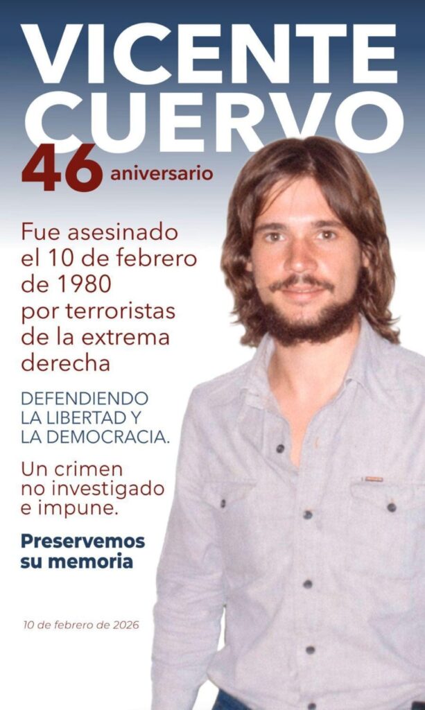 Pero no olvidamos a Vicente. Su familia logró en 2023 que fuera reconocido como víctima del terrorismo con el apoyo e investigación del Centro Memorial de Víctimas del Terrorismo de Vitoria. Desde 2025, los jardines que se encuentran entre las calles Sierra Bermeja y Antonio Folgueras del distrito de Puente de Vallecas llevan el nombre de Vicente Cuervo, a propuesta de la Asociación Vecinal de Puente de Vallecas-San Diego.