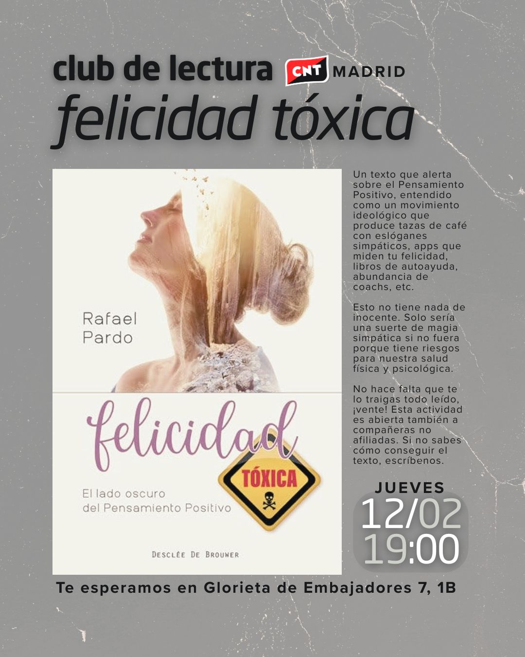 No hace falta que te lo traigas todo leído, ¡vente! Esta actividad es abierta también a compañeras no afiliadas. Si no sabes cómo conseguir el texto, escríbenos. Te leemos en social@madrid.cnt.es.