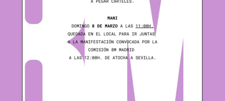 Con motivo de la huelga feminista tendremos permanencias todos los días de la semana de 09:00 de la mañana a 12:00 de la noche en nuestro local de Glorieta de Embajadores 7, 1º B. Además el viernes 8 nuestro local servirá también de lugar de descanso y avituallamiento, así como…